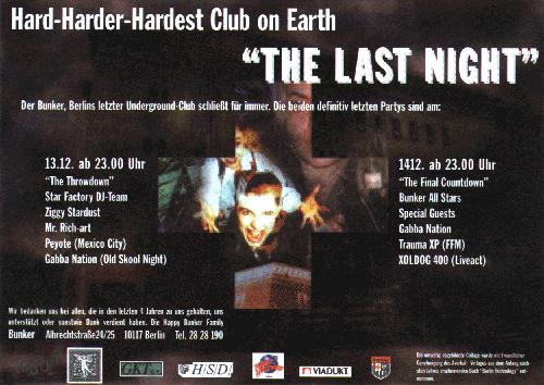 | An old WW II air shelter in East Berlin near the former iron curtain, several meters of concrete around you, smoke and strobes, excellent PA, home of Gabba Nation and hard as fuck heaven for real hardcore gabbers. Alas now its right in the center of Berlin, an area being sold out and commercialized, theres no space in the political minds for an underground location that includes bald-headed gabber punks, s/m fetishists, gay people, practice rooms for rock groups, and an art galery. Besides the club was run for four years without any license, fire exits etc., so the last party was scheduled for 14 December 1996... | |||